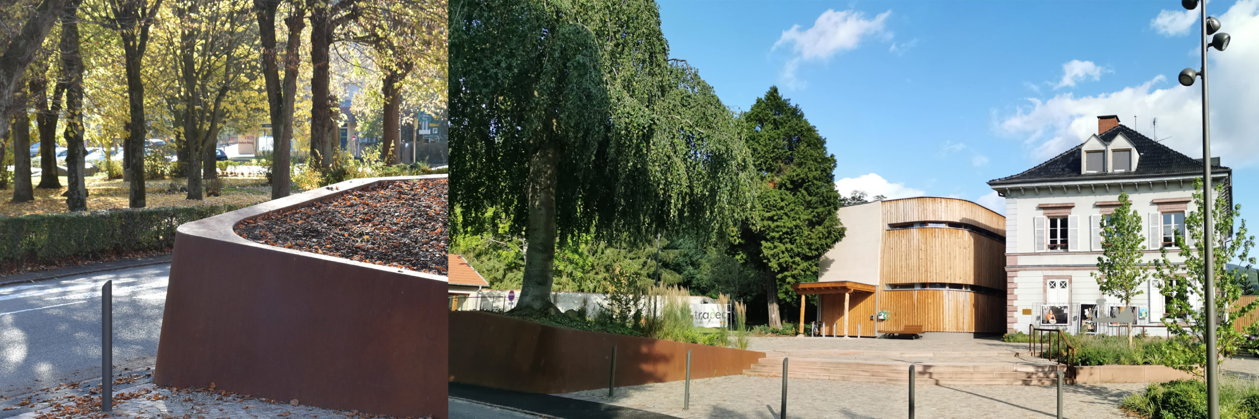 D’un lieu confidentiel et peu visible, l’espace proposé s’ouvre sur la ville par un jeu subtil d’emmarchements et de gradins qui créent le lien entre l’entrée de la médiathèque et la ville. L’effet d’appel est accentué par un cadrage visuel formé par des massifs verdoyants. Le hêtre pleureur, monument du jardin, définit le symbole géographique de la place haute. Entouré d’un voile corten, il devient l’élément signalétique majeur qui manquait jusqu’alors à la médiathèque.